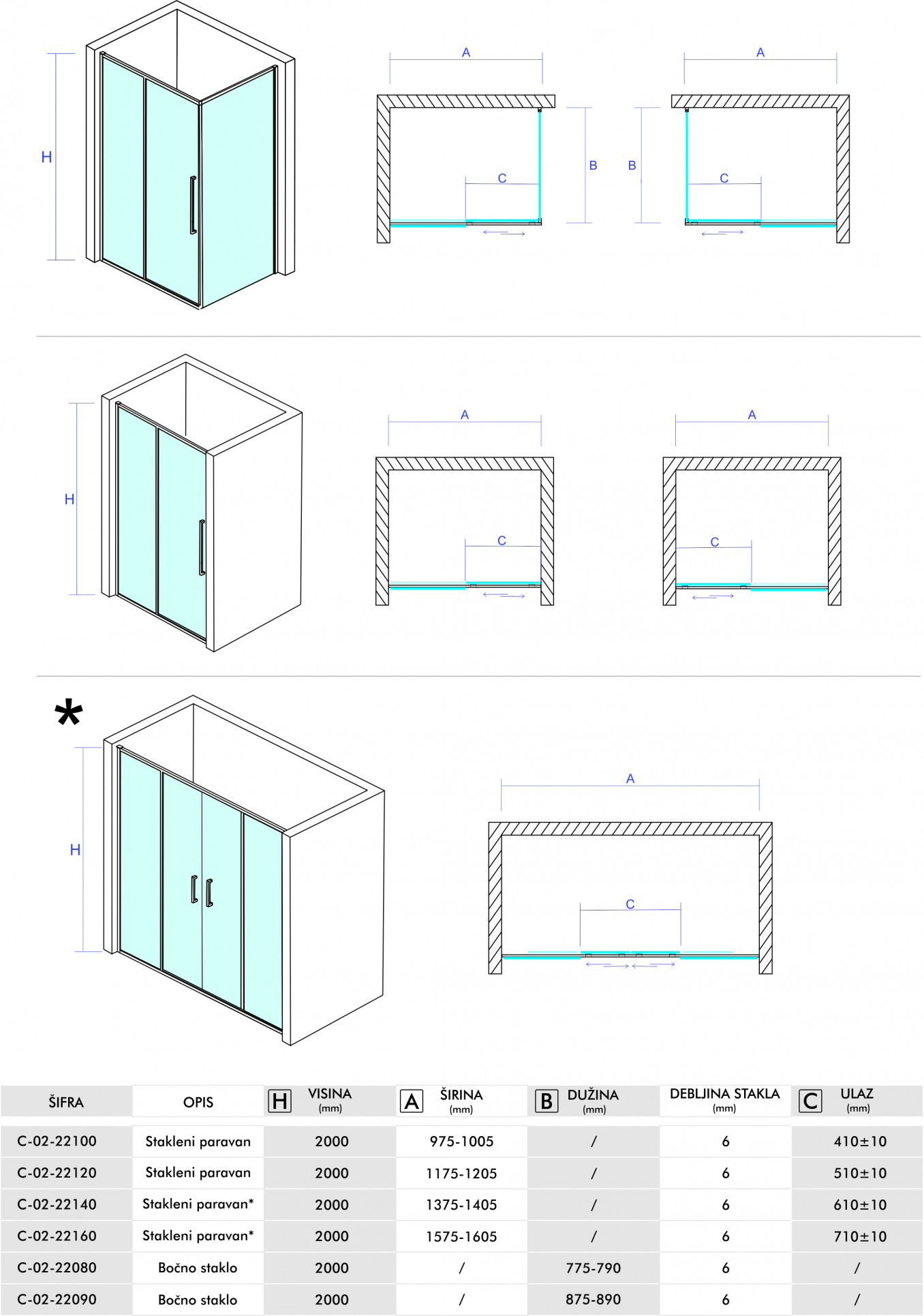 Stakleni paravan COPEN DEVON200 160x200cm staklo 6mm providno sa tankim ramom